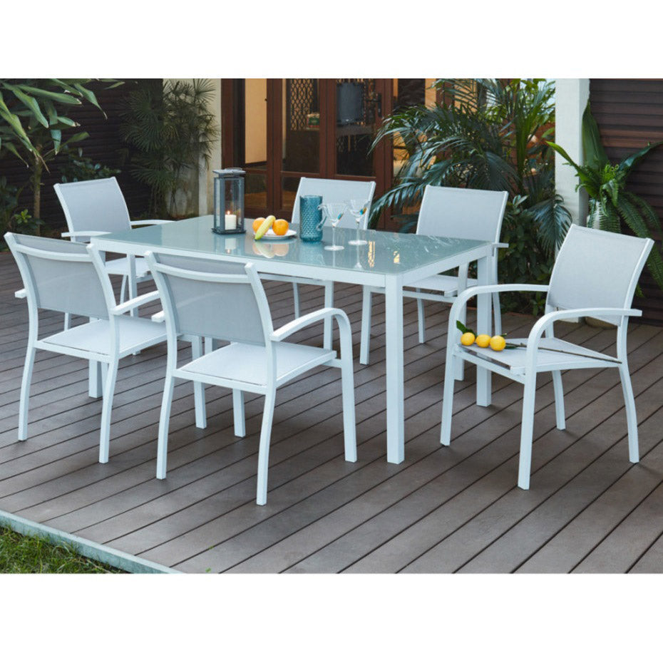 Der Modelltisch Miami kombiniert eine epoxidbeschichtete Eisenstruktur mit glänzendem gehärtetem Glas. Seine essentiellen Linien ermöglichen es dem Tisch, sowohl draußen (Garten) als auch drinnen (Küche, Büro) seinen Platz zu finden. Die mit einer Epoxidfarbe überzogene Struktur verleiht dem Tisch eine Garantie für Langlebigkeit, da er nicht durch Regen oder Tau rostet. Die Beine haben ein Anpassungssystem an der Unterseite, falls der Boden uneben ist.