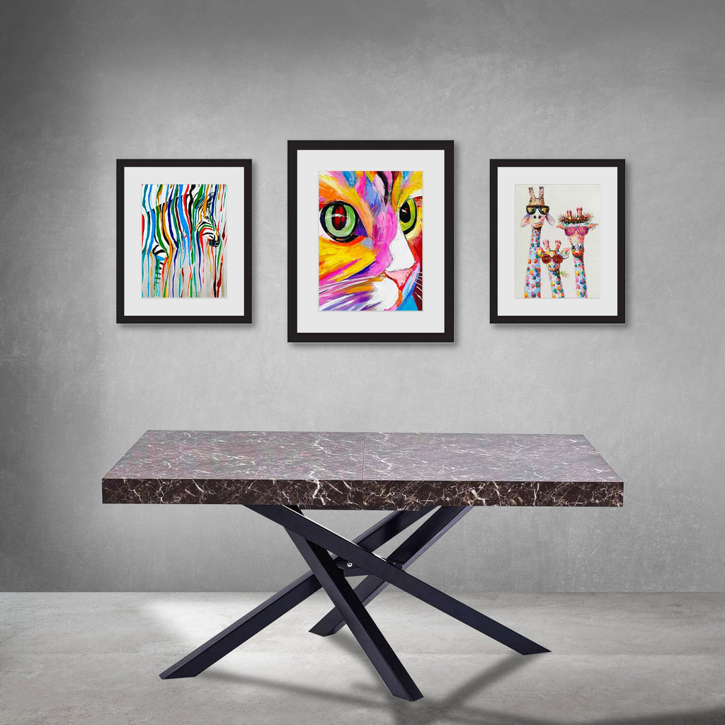 Es ist ein praktischer und moderner Tisch, der sich perfekt für die Dekoration eines Wohnzimmers oder einer Küche in einem jungen, industriellen und originellen Stil eignet.Sein fesselndes Design wird Sie überzeugen! Es zeichnet sich durch eine Melaminplatte und gekreuzte pulverbeschichtete Eisenbeine aus, die hohe Stabilität und Komfort garantieren. Der Tisch ist in seiner verlängerten Version für 8 bis 10-12 Personen ausgelegt. Beim Öffnen des Tisches sind 2 Verlängerungen zu verwenden. Das Produkt wird in 2 Pakete zerlegt, wobei alles, was für die Montage benötigt wird, bereits im Paket enthalten ist.
