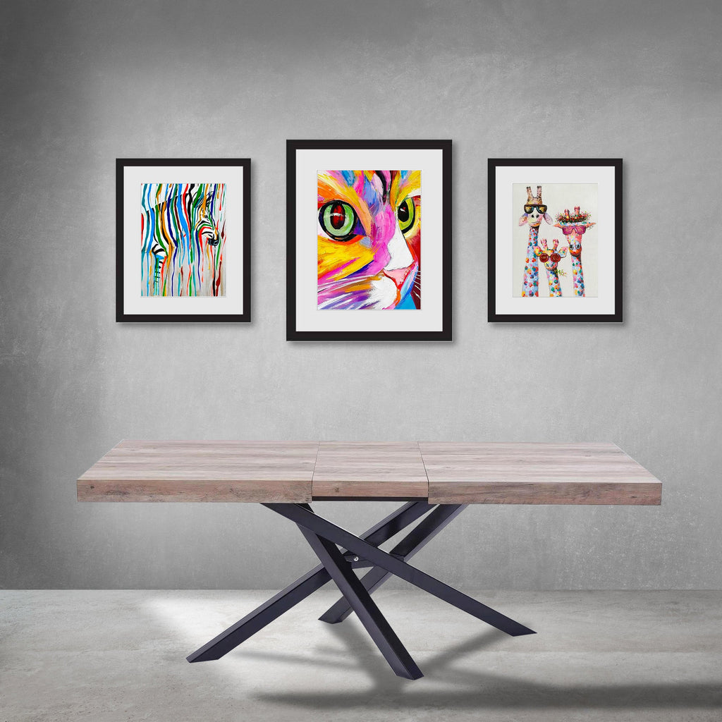 Es ist ein praktischer und moderner Tisch, der sich perfekt für die Dekoration eines Wohnzimmers oder einer Küche in einem jungen, industriellen und originellen Stil eignet.Sein fesselndes Design wird Sie überzeugen! Es zeichnet sich durch eine Melaminplatte und gekreuzte pulverbeschichtete Eisenbeine aus, die hohe Stabilität und Komfort garantieren. Der Tisch ist in seiner verlängerten Version für 8 bis 10-12 Personen ausgelegt. Beim Öffnen des Tisches sind 2 Verlängerungen zu verwenden. Das Produkt wird in 2 Pakete zerlegt, wobei alles, was für die Montage benötigt wird, bereits im Paket enthalten ist.