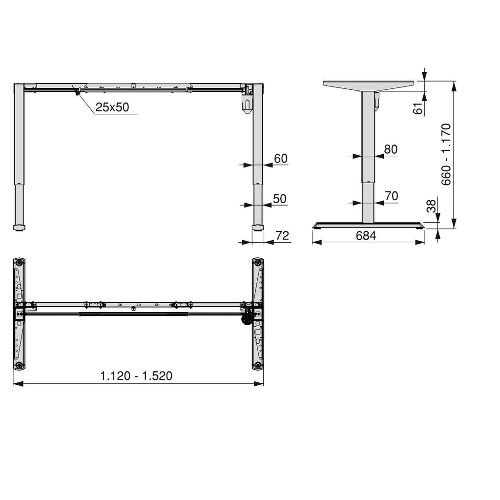 - Höhenverstellbar von 660 bis 1170 mm und maximale Belastung von 55 kg.