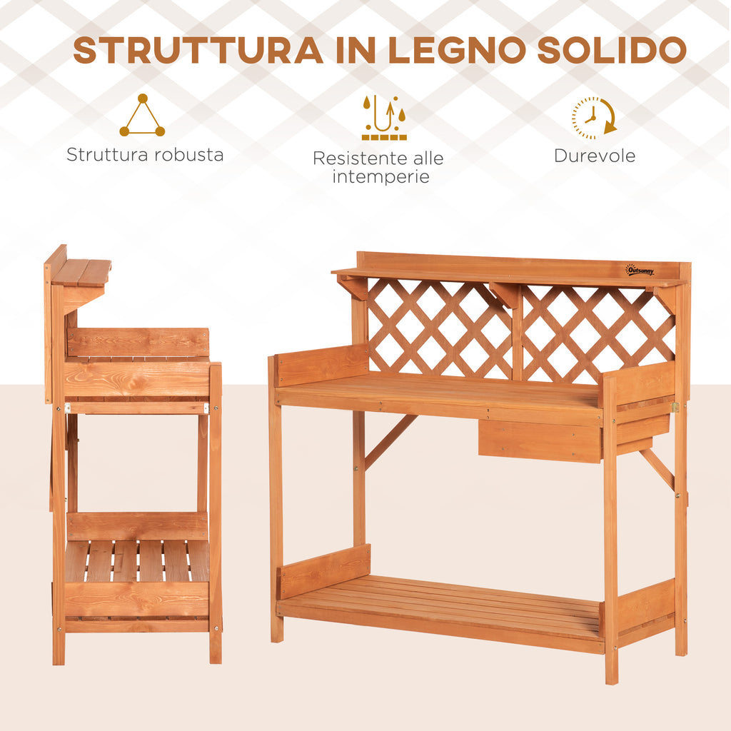 Diese Blumenbank hat ein einfaches Aussehen, aber eine vielseitige Funktionalität, die Ihrem Garten oder Ihrer Terrasse eine praktische Note verleiht. Aus Massivholz gefertigt, hat es eine Mesh-Rückwand, die sich ideal zum Aufhängen von Werkzeugen oder LED-Leuchten eignet. Das kleine Regal, die Regale und die Schublade dieses Gartentisches bieten Ihnen Platz für Töpfe, Werkzeuge und Samen. Schauen Sie sich diese praktische Werkbank an und verleihen Sie Ihrem Leben im Freien praktische Anwendbarkeit.