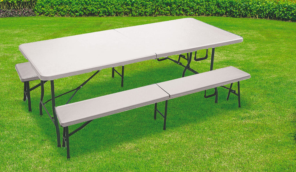 Klappbänke und -tische können für den sofortigen Transport in einer Aktentasche zusammengeklappt werden. Sie sind leicht, einfach zu montieren und garantieren dank der Stahlstruktur eine lange Lebensdauer und Widerstandsfähigkeit.