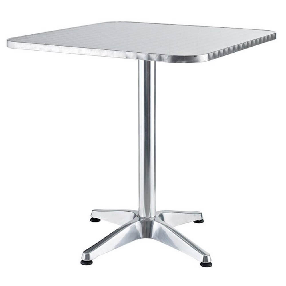 Quadratischer Aluminiumtisch mit verstellbaren Füßen.