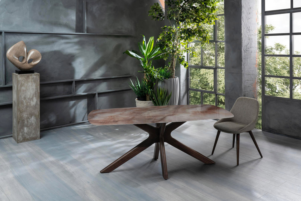 Gemini è un tavolo raffinato e inedito, in cui linee fluide e morbide giocano tra loro creando dettagli di grande forza visiva. Sul basamento a forma di stella, realizzato in massello di noce, poggia delicatamente la piana in ceramica marmo alabastro lucido. La superfice lattata del tavolo Gemini, con venature trasparenti che vanno dal grigio all’arancione, dona eleganza e distinzione. Frutto di una ricerca che esplora gli stili e le ispirazioni più diverse, Gemini è un vero protagonista dell’area living, inserendosi armoniosamente sia negli ambienti dal design moderno, sia negli spazi che prediligono il lusso e lo stile classico. Ideale è l’abbinamento con le sedie rivestite in tessuto e struttura in massello di noce, come le sedie Vera e Astrid, che si sposano elegantemente con la graziosa base del tavolo.