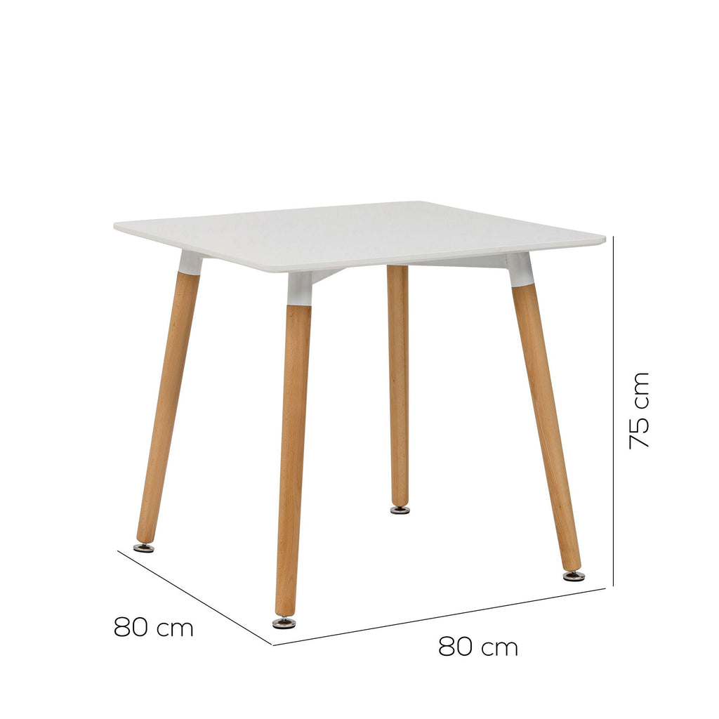 Tavolo con gambe in legno di faggio e piedini in metallo. Piano in MDF laccato bianco sostenuto da una base in metallo laccato bianco.