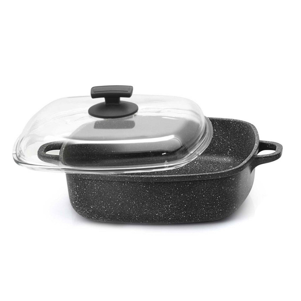Tegame Quadro cm.28x28 in alluminio pressofuso con rivestimento antiaderente con coperchio vetro borosilicato. Forma alta e capiente,pomolo in bakelite di facile presa. La particolare forma quadrata alta e capiente è ideale per le lunghe cotture a fiamma medio bassa. Utilizzabile anche in forno (senza il coperchio). Bello da servire direttamente in tavola. diam. Cap.Lt. Altezza/Height cm. 28x 28 5.50 lt. 10.5 cm.