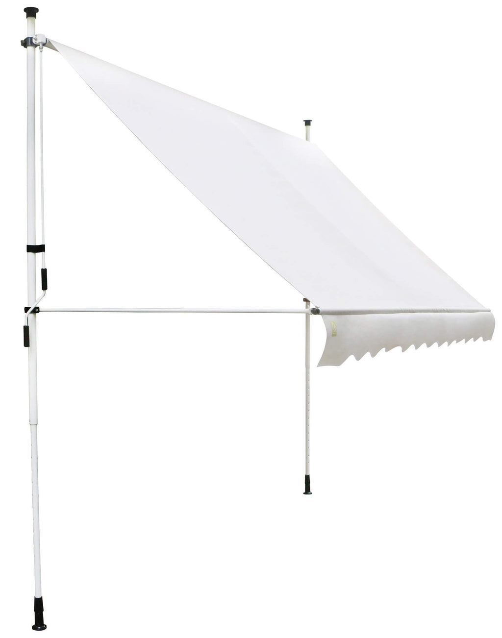 Außenmarkise mit Ausladung und Trägerstruktur aus weißem Aluminium, leicht zu bewegen und zu befestigen. 280 g ecrufarbenes Polyestergewebe, UV80-Schutz und regenfeste Behandlung.
