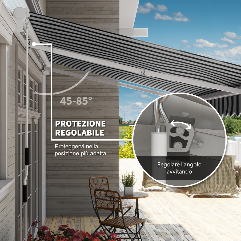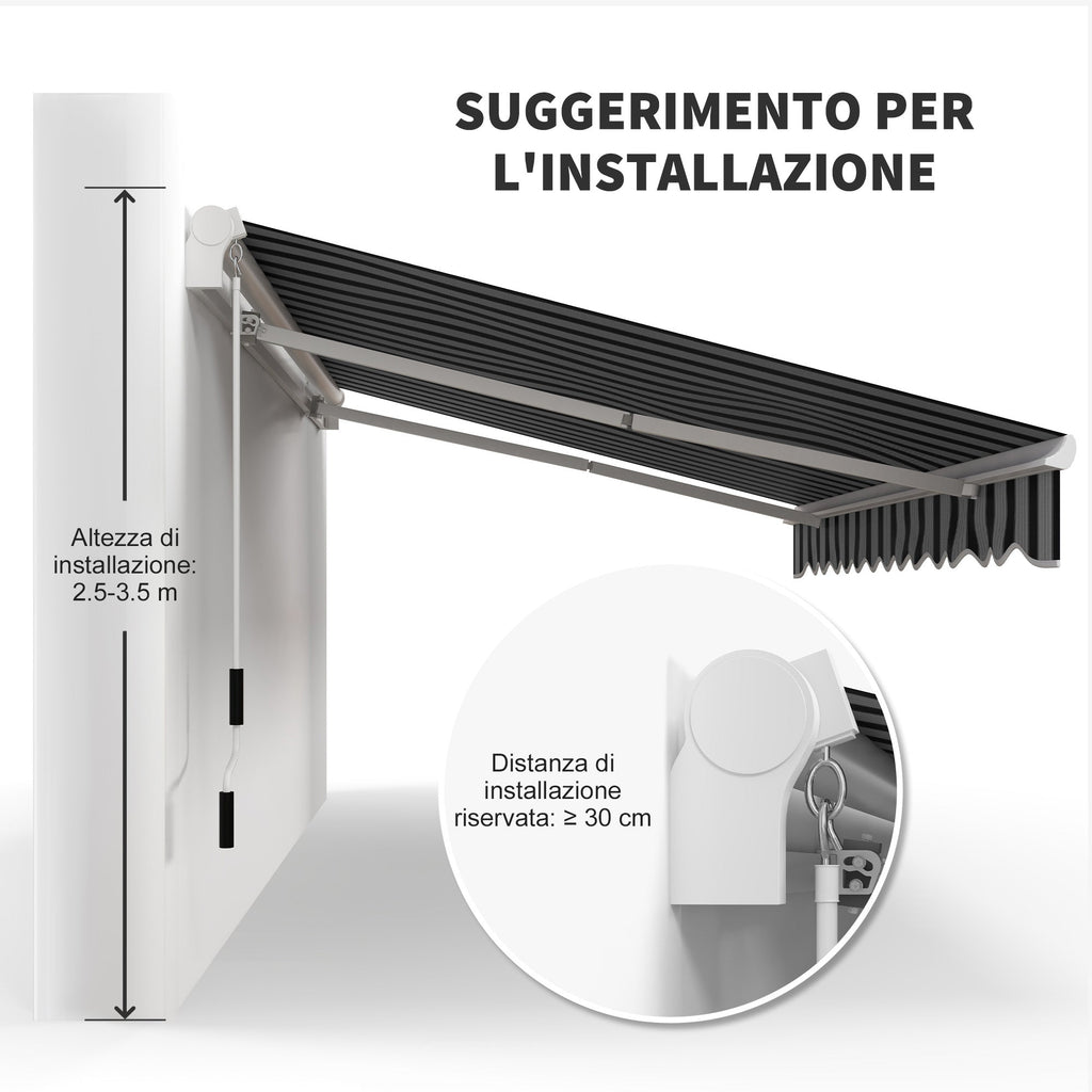 Proteggi la tua casa con la tenda da sole a bracci! Ha una solida struttura in metallo e alluminio e una copertura parasole in poliestere impermeabile, che garantiscono resistenza e lunga durata. Si monta facilmente al muro grazie agli accessori inclusi e si apre e chiude facilmente con la manovella integrata. Goditi le giornate all'aperto proteggendoti efficacemente dal sole con la nostra tenda da sole avvolgibile.