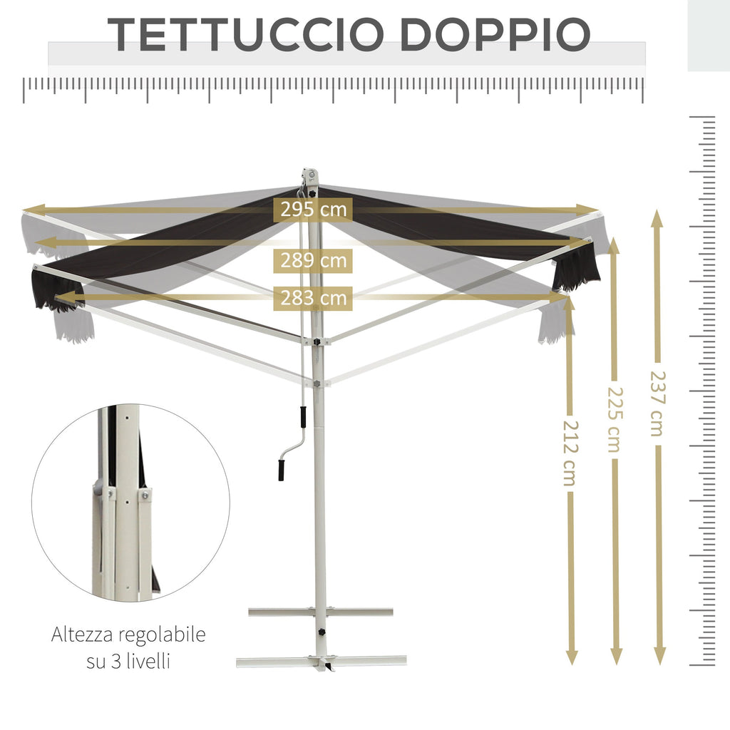 - ABMESSUNGEN: Gesamtabmessungen: 295 L x 294 T x 250 Hcm. Kurbellänge: 148 cm. HINWEIS: Schließen Sie die Markise an regnerischen Tagen, um eine Ansammlung von Wasser zu vermeiden, die Schäden verursachen könnte.