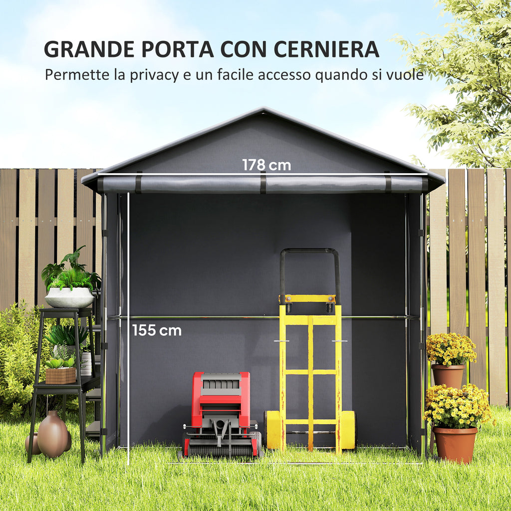 Tieni le tue bici e attrezzi da giardinaggio al riparo nel capanno da giardino. Realizzato in resistente tessuto Oxford 420D, questo capanno portatile assicura che i tuoi oggetti siano al sicuro da vento leggero, pioggia e sole. L'ampia porta con zip favorisce il flusso d'aria e l'accesso allo spazio interno, mentre il robusto telaio in acciaio zincato resiste alla ruggine e all'usura. La scelta perfetta per uno spazio esterno sempre ordinato!