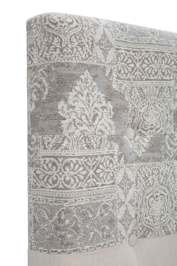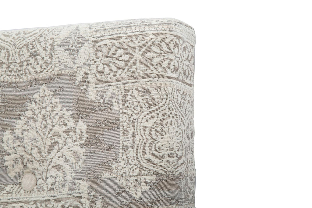 Bettkopfteil aus Holz und gepolstertem Stoff. Die Linie Damasco erinnert an englische Spitze und Keramik. Die Farben Taupe und Creme schaffen eine märchenhafte Atmosphäre wie in einem modernen Puppenhaus. Ein zarter Shabby-Geschmack, der jede Umgebung fein verschönern kann.