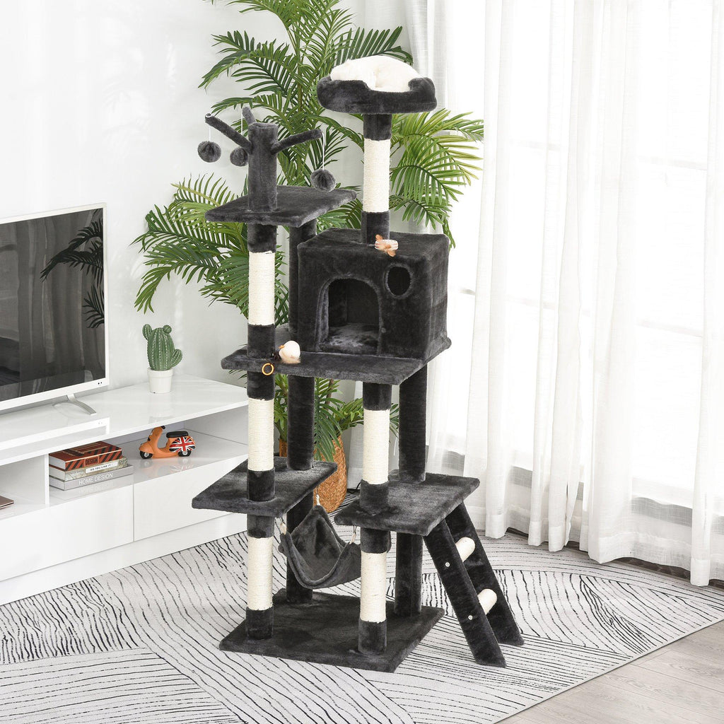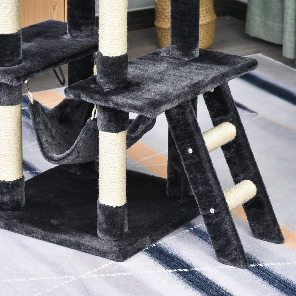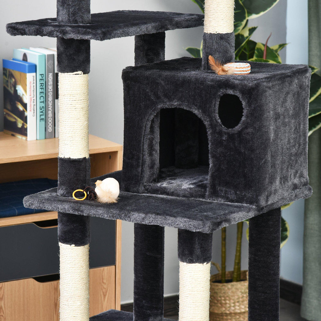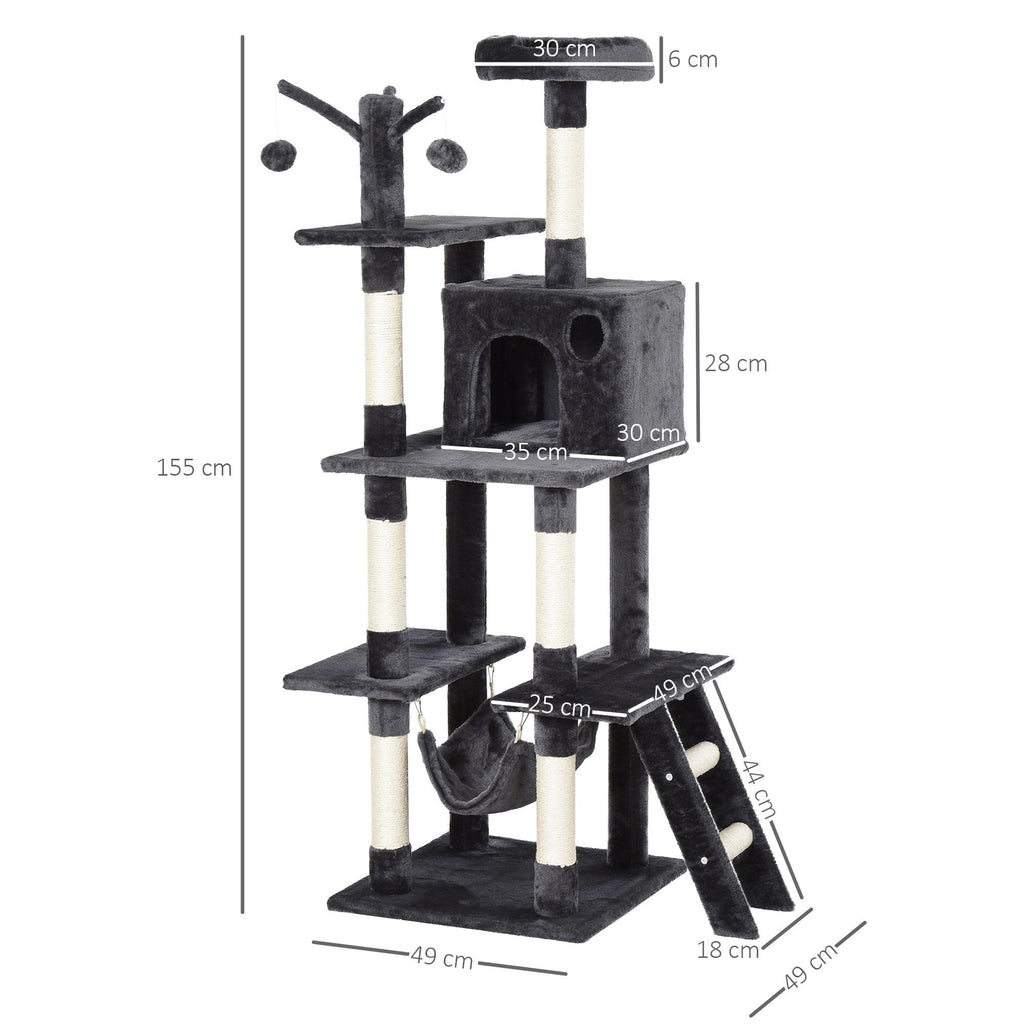 Kratzbaum mit 2 Hängemattenhütten und Spielzeug für Katzen 49 x 49 x 155 cm in dunkelgrauem Sisalplüsch