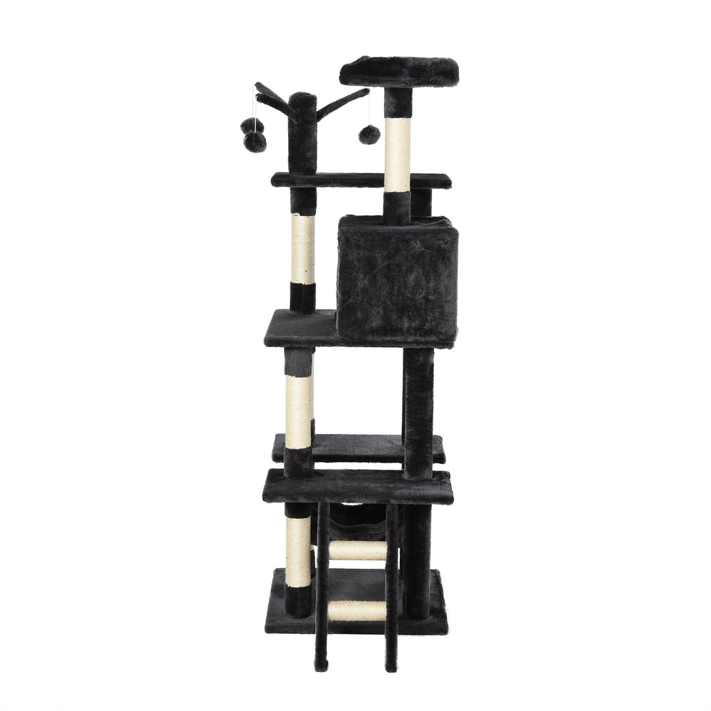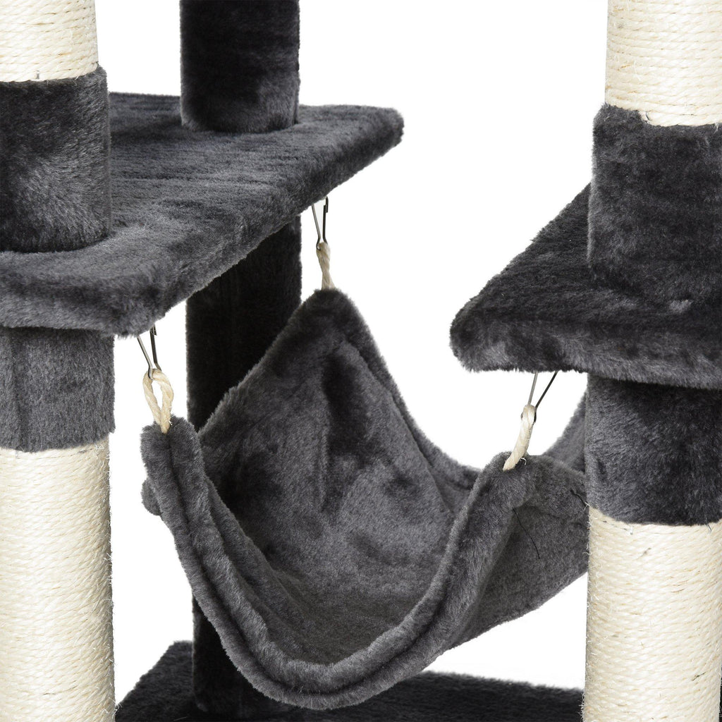 Befriedigen Sie die natürlichen Instinkte Ihrer Katze sicher mit Kratzbäumen! Dieses Multi-Aktivitätszentrum mit Sisalpfosten und bequemen Sitzstangen, 3 hängenden Bällen, Hängematte und Hundehütte. Katzenkratzer kommen sowohl dem Haustier als auch dem Besitzer zugute, indem sie einen Ort bieten, an dem Katzen den Drang zum Krallen und Klettern lindern können, und indem sie Ihre Möbel vor Beschädigungen bewahren. Ruhen, spielen, trainieren, Ihre Katzen können den ganzen Tag darin verbringen, eine komfortable Einheit für Ihre Freunde.