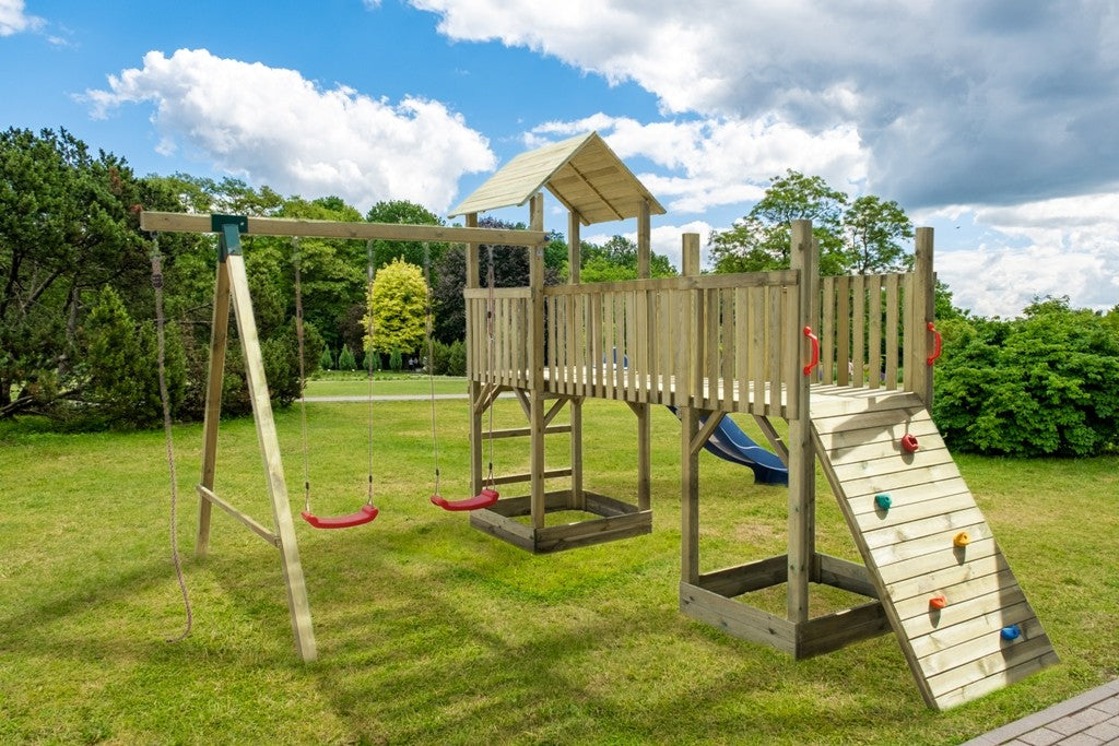 Turm mit Schaukel 2 Sitze und Rutsche 410x480x280 cm in Holz