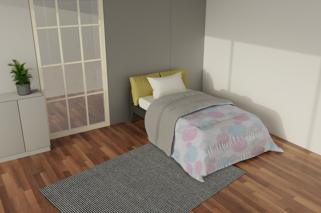 Winterdecke aus sehr weicher, hypoallergener Mikrofaser, die mit einer Behandlung bedruckt ist, die ihr einen samtigen Griff verleiht und ihr ein größeres Wärmegefühl verleiht.