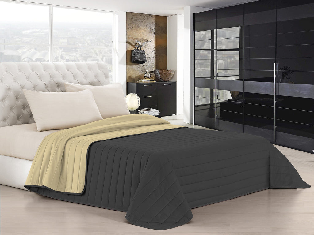 Einfarbige zweifarbige Steppdecke aus sehr weicher hypoallergener Mikrofaser mit " Pfirsichhand "-Behandlung. Unsere Steppdecken waren schon immer ein Synonym für Qualität und Schönheit. Die Verwendung der besten Materialien und die hypoallergene Polsterung machen sie zu einem Produkt von höchster Qualität. Ultraweiche, hypoallergene Mikrofaser, einfarbig ( reversibel ), mit Behandlung, die ihr einen samtigen Griff verleiht und ihr ein größeres Wärmegefühl verleiht.
