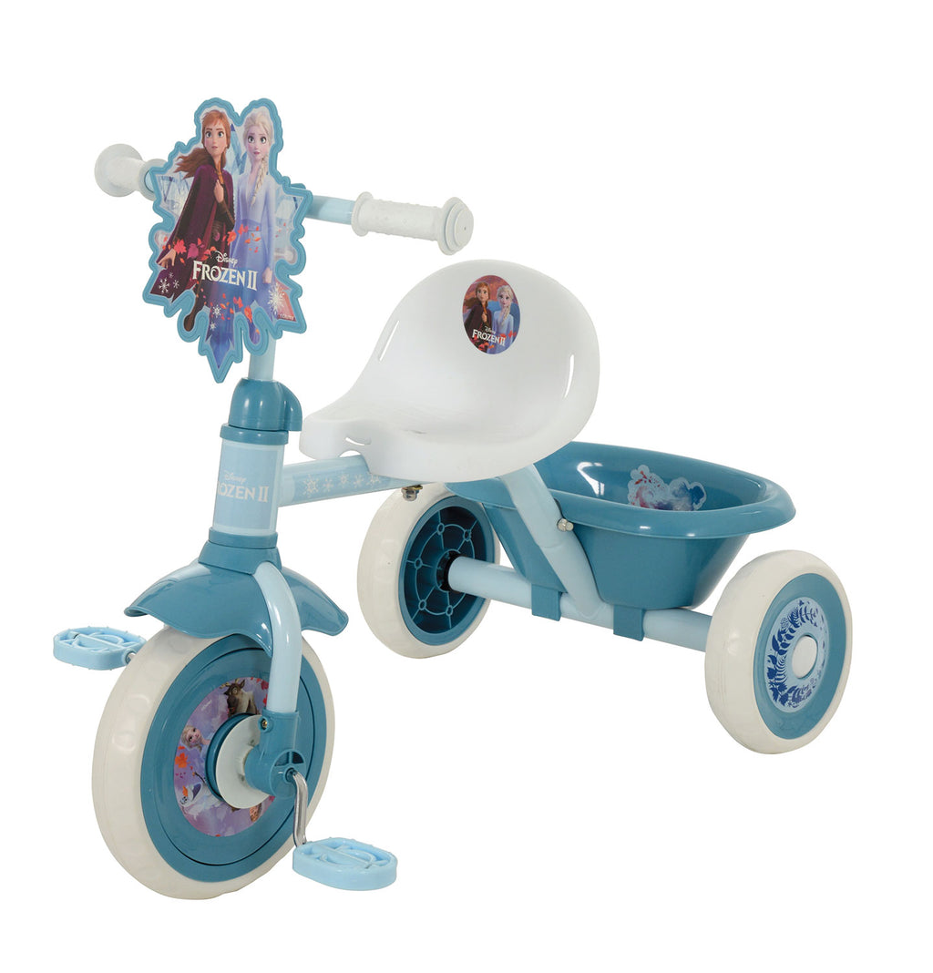 Triciclo con maniglia posteriore regolabile e removibile; telaio in acciaio. Triciclo con maniglia posteriore regolabile e removibile per consentire la modalità spinta; ruota anteriore libera munita di un meccanismo di blocco per permettere la spinta dalla maniglia posteriore. Il telaio è in acciaio robusto che può sopportare fino a un peso massimo di 20 Kg; gli pneumatici sono in materiale EVA; sulla ruota anteriore è posizionato un parafango. Nella parte posteriore del triciclo si trova un portaoggetti; nella parte anteriore, all'altezza del manubrio, è posizionata una targa con l'immagine del personaggio.