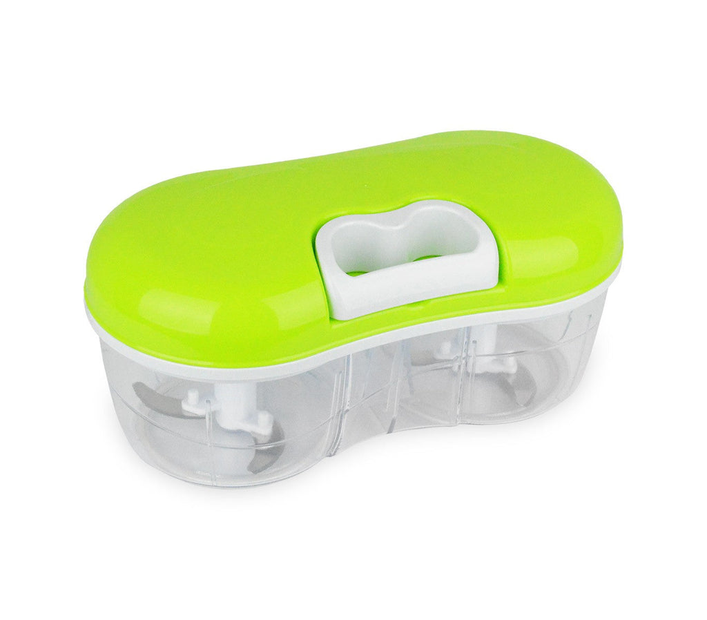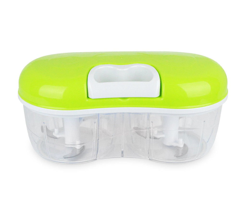 Ein revolutionäres Accessoire, der ideale Begleiter für Ihre Küche! In Rekordzeit schneiden, hacken, mixen und Sahne schlagen. Ausgestattet mit 2 scharfen Stahlklingen mit automatischer Rotation, mit denen Sie alle Arten von Gemüse, Obst, Eiern, Zwiebeln, Knoblauch, Gurken, Karotten und vielem mehr zerkleinern können! Ideal für die Zubereitung hervorragender Salate und Snacks für die Kleinen. Sehr einfach zu bedienen, einfach die zu zerkleinernden Zutaten einlegen und den mit dem Deckel verbundenen Griff ziehen, um die Bewegung der Klingen zu aktivieren. Schneller und einfacher als mit jedem Messer schneiden Sie alle Zutaten in einer Bewegung zusammen. Einfach zu säubern. Dank der zwei getrennten Behälter können Sie verschiedene Lebensmittel gleichzeitig zerkleinern, ohne sie zu vermischen.