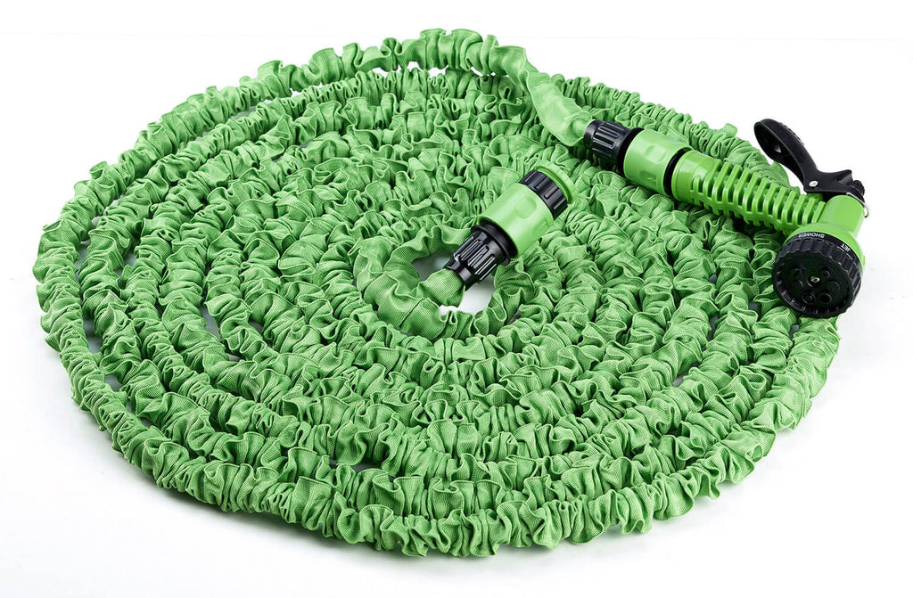 Kompakter und leichter Gartenschlauch, der sich bis zu 22,5 Meter ausdehnt, wenn Wasser durch ihn fließt. Keine Falten, keine Knoten und keine Verwicklungen. Nach Gebrauch schrumpft es auf eine Länge von 7,5 Metern, sodass es platzsparend verstaut werden kann. Die Hülle ist reißfest und widerstandsfähig aus Polyester, daher glatt, um beim Überfahren von Steinen und Kanten gleiten zu können, ohne sie zu beschädigen. Lieferung komplett mit Armaturen und Multifunktionspistole mit 7 Wasserstrahlen.