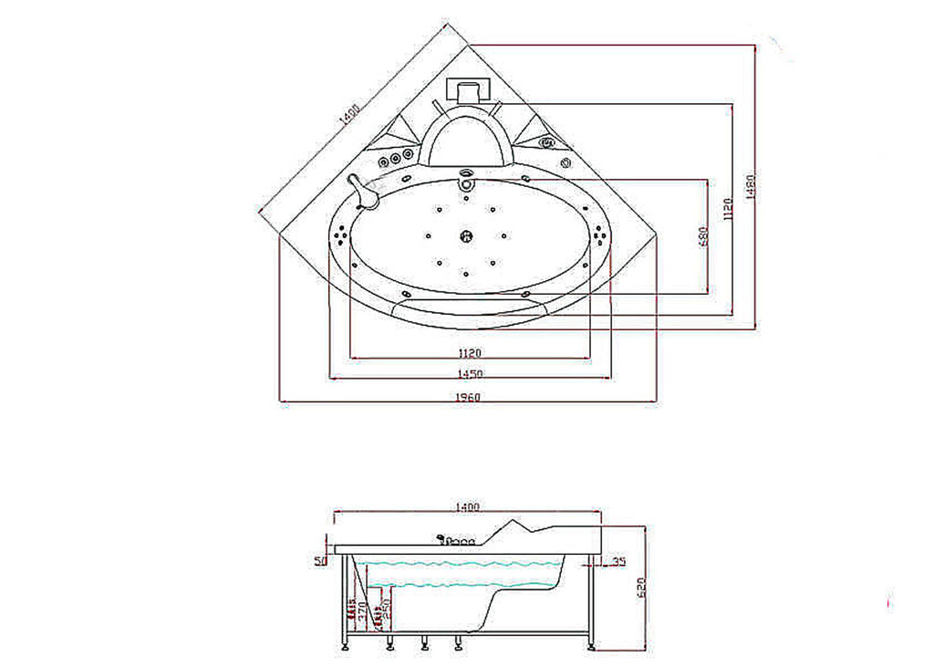 - Abmessungen der Wanne: Basis 140 x 140 cm
