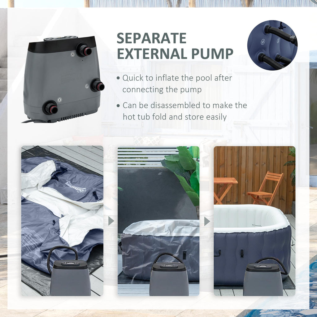 - AUFBLASBARES SPA: Dieser aufblasbare Whirlpool ist für 4-6 Personen geeignet. Schließen Sie die externe Aufblaspumpe an und drücken Sie die Hydromassagetaste, um das Spa schnell aufzublasen. Die Pumpe kann bequem zerlegt und gelagert werden.
