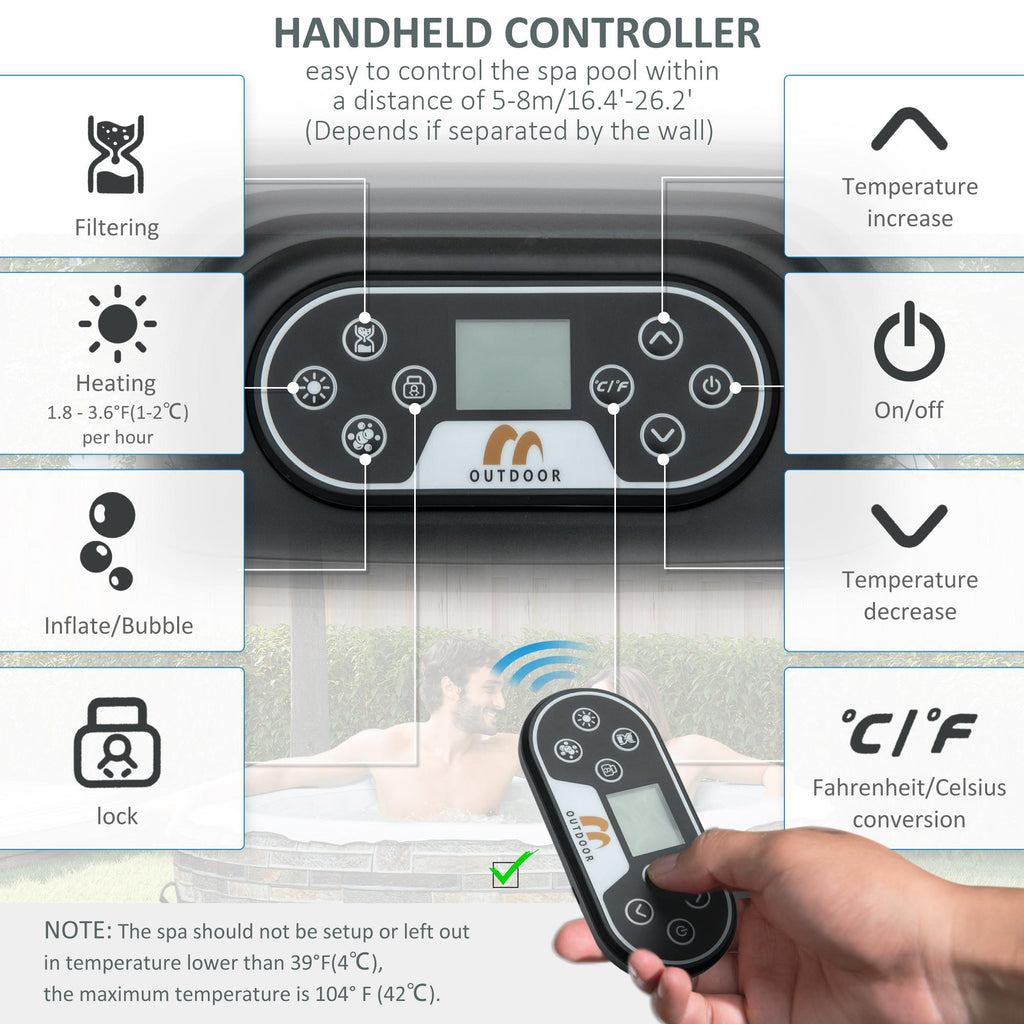 - HEIZFUNKTION: Über das integrierte LCD-Panel können Sie jede Funktion des Outdoor-Whirlpools einfach einstellen. Der Heizbereich beträgt 1-2°C pro Stunde, bis maximal 40°C. Lassen Sie das Spa bei Temperaturen unter 4°C nicht draußen. 108 DÜSEN: Entspannen Sie sich im Hydromassage-Pool mit seinen 108 leistungsstarken eingebauten Düsen, um Spannungen wie in einem echten Spa abzubauen.