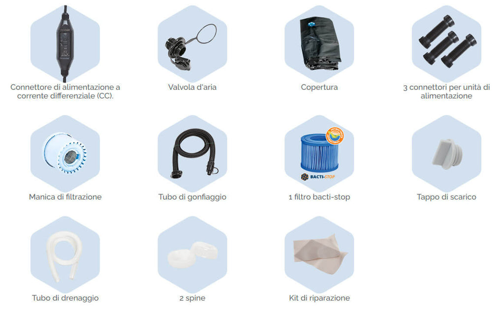- Die um 360° verteilten Massagedüsen in Kombination mit einem leistungsstarken 650-W-Gebläse sorgen für eine homogene und angenehme Pflege der Massageblasen. Die Motoreinheit heizt das Poolwasser auch schnell auf 42 °C auf, damit Sie das ganze Jahr über Spa-Vergnügen genießen können!