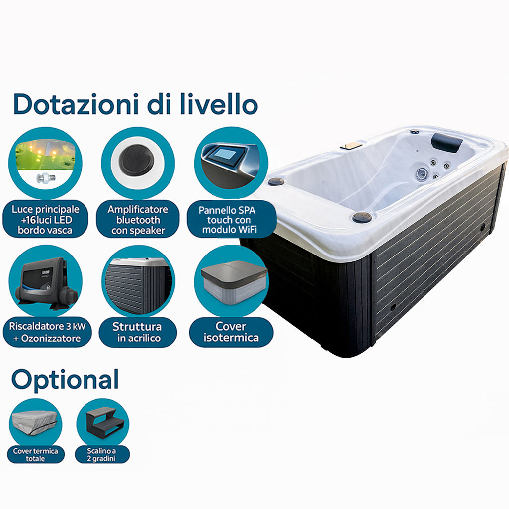 La consegna verrà effettuata a livello stradale, il trasporto non include l’installazione, collocazione o spostamento del prodotto. La SPA viene spedita completamente assemblata, richiede unicamente la connessione elettrica, che sebbene sia molto semplice, raccomandiamo venga eseguita da un elettricista professionista.