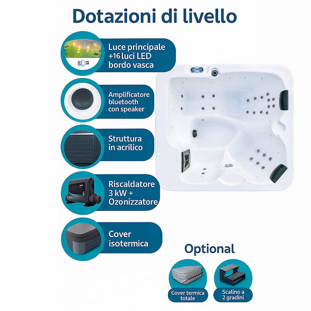 - RELAX TOTAL BODY: 32 jet di massaggio disposti in modo strategico per offrire sia effetti rilassanti che tonificanti: alle spalle, alla zona lombare, ai glutei, fornendo un massaggio completo che coinvolge tutto il corpo.