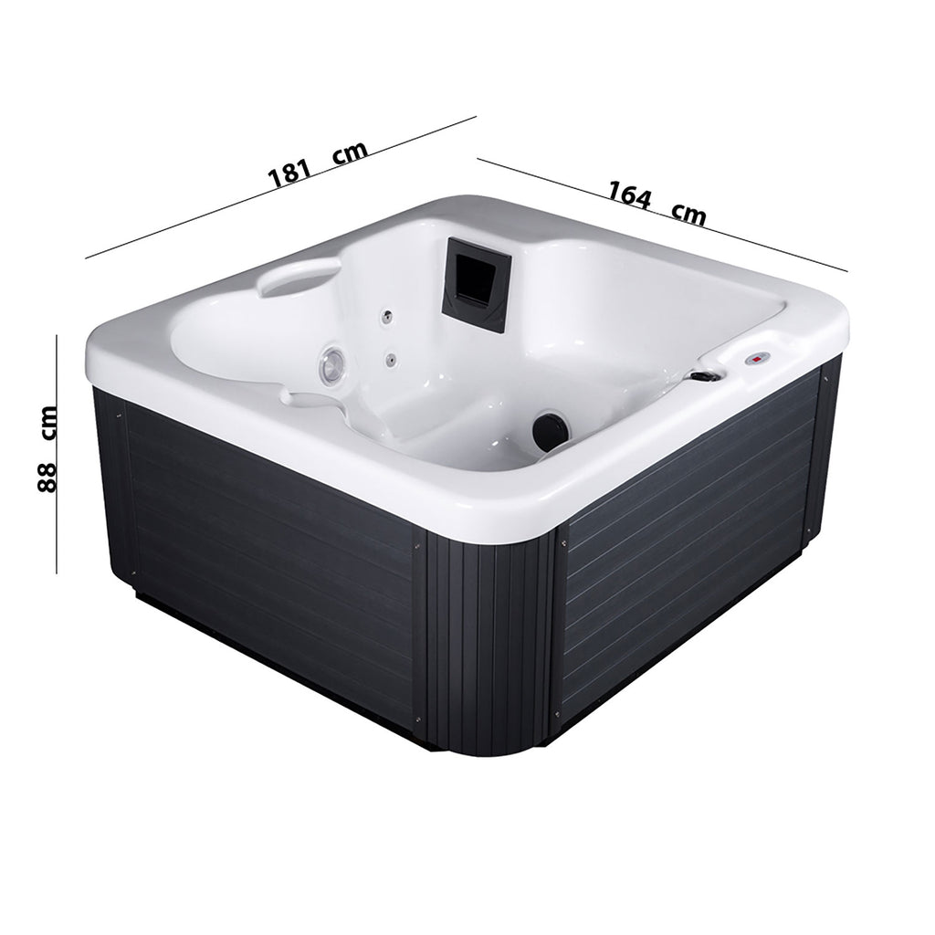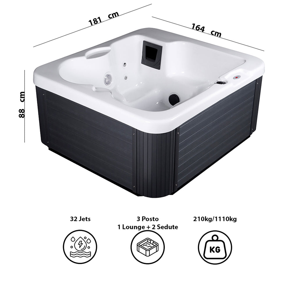- CAPIENZA PER 3: Cleopatra conta 3 posti confortevoli, 1 lounge e due sedute, ottime per momenti in coppia o con amici, per serate rilassanti, lettura o meditazione, grazie alle funzioni audio, luci e design. Le misure sono accuratamente studiate: 181 cm x 164 cm x 88 cm, pensate per dare spazio ai movimenti interni restando compatta per un idromassaggio monoblocco.