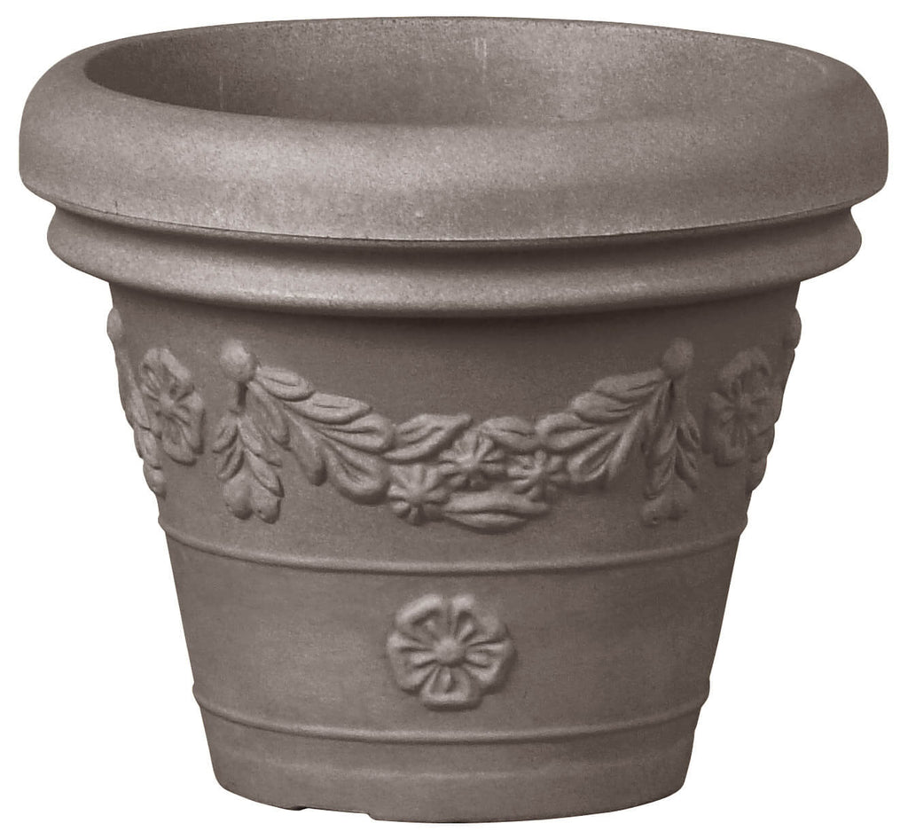 Die Vase Festonato Classic ist eine Vase im klassischen und eleganten Stil aus verstärktem Kunststoffharz und wird in Rotationstechnologie (Rotomoulding) hergestellt, die eine hohe Widerstandsfähigkeit und Festigkeit garantiert und die Herstellung von leichten Produkten auch in den größten Dimensionen ermöglicht. Die matte und leicht gestreifte Oberfläche verleiht der Vase ein ultraechtes Aussehen, das Terrakotta und natürlichen Materialien sehr ähnlich ist. Es lässt sich leicht ohne Reinigungsmittel waschen, ist stoßfest und zu 100 % ungiftig und recycelbar. Die Festonato Classic Vase hat einen Erleichterungspunkt (vorbereitetes Loch) für eventuelle Bohrungen, um den Wasserablauf zu ermöglichen. Diese Vase kann problemlos als Terrassen- oder Gartenvase verwendet werden, da sie UV-beständig und somit farblich unveränderlich ist. Hitze und Kälte hält die Vase problemlos von Temperaturen von -30°C bis +60°C aus.