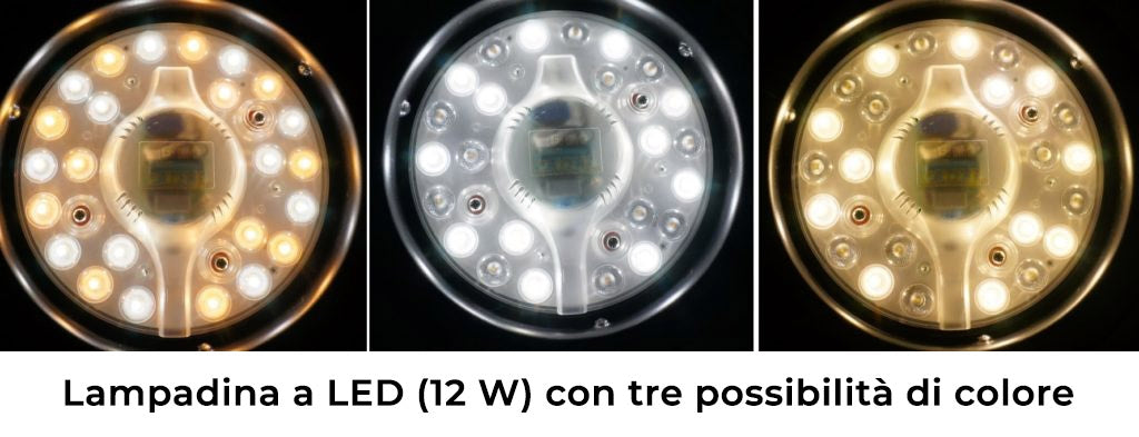 - Ausgestattet mit 1 LED-Lampe (12 W) mit drei Farbmöglichkeiten