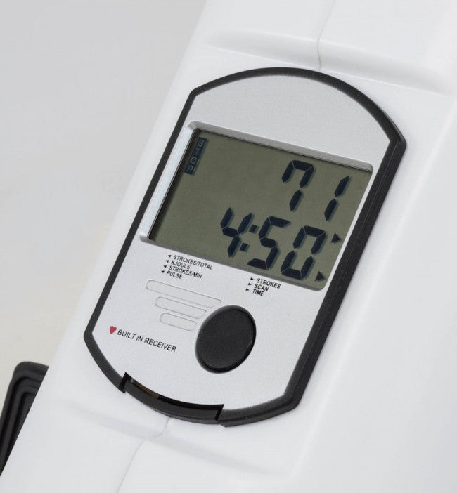 Das LCD-Display des Computers zeigt ständig die Anzahl der Schläge pro Minute, Gesamtschläge, Kalorien, Zeit und Pulse an, erfasst vom Pulsmesser, nicht im Lieferumfang enthalten, integrierter Empfänger.