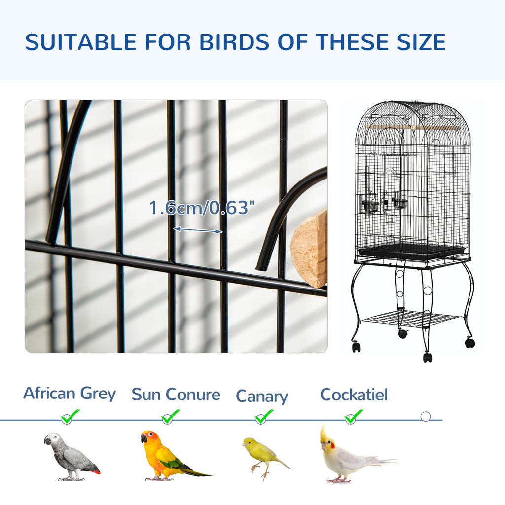 Geben Sie Ihrem besten Freund ein neues Zuhause! Dieser Vogelkäfig aus Stahl und Metall hat nicht nur einen Vintage-Look, sondern ist auch extrem langlebig. Die Basis ist mit 4 Rädern ausgestattet, um sie bequem zu bewegen, und einer Ablagefläche, auf der Sie das Wasser und Ihr Lieblingsessen arrangieren können.