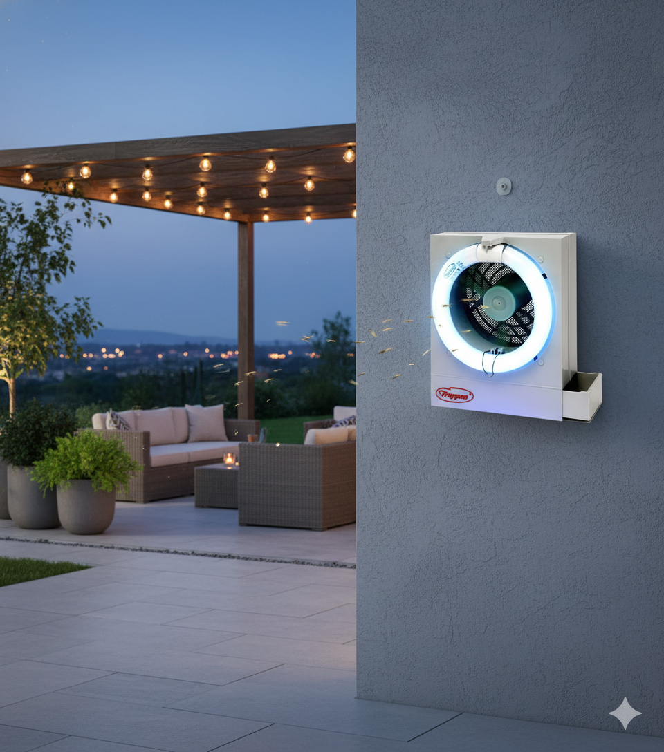 Eine spezielle aktinische 22-Watt-Lampe zieht fliegende Insekten an (Fliegen, Mücken, Wespen, Mücken, Motten usw.) und ein ausgeklügeltes Turbo-Saugsystem mit einem axio-radialen phosphoreszierenden Propeller saugt sie auf und befördert sie in einen Schublade ausziehbar, aus der sie nicht mehr herauskommen können, wo sie an Austrocknung sterben werden. Entleeren Sie den Inhalt regelmäßig wie einen Aschenbecher.